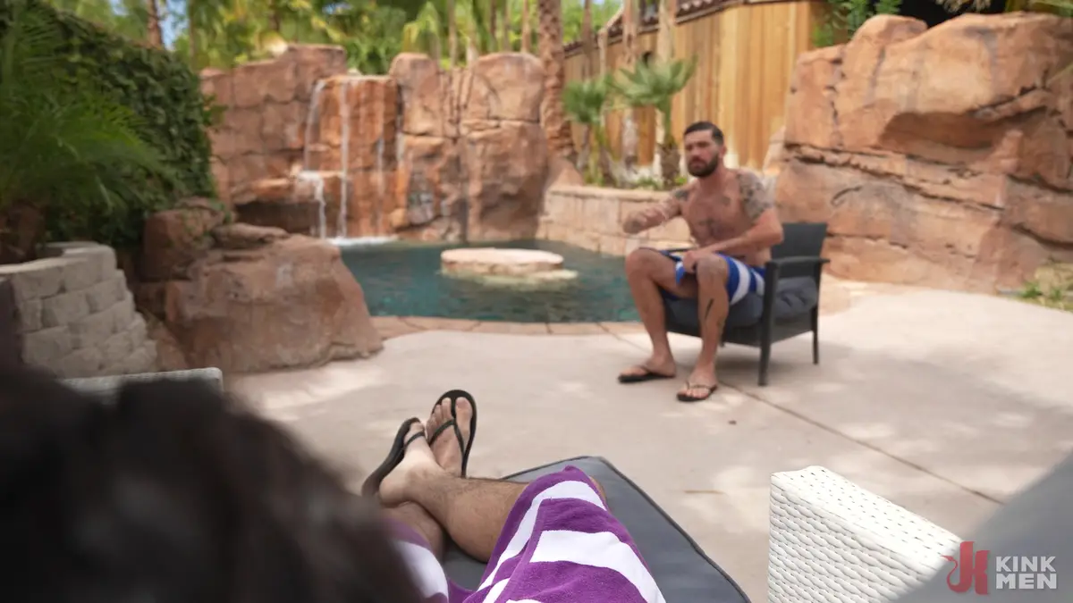 Yinnie DeDom is as his name suggests usually the one to give out the punishment but today we get to share with you this super hot scene where Yinnie completely submits to Chris Damned. Yinnie is prowling the club looking for a hook up when he gets bored and decides to make his way to the pool area to have a smoke. Chris Damned comes over and sits in the chair across from him and lights up. It only takes seconds for the guys to lock eyes with one another and start getting horny stroking their cocks.