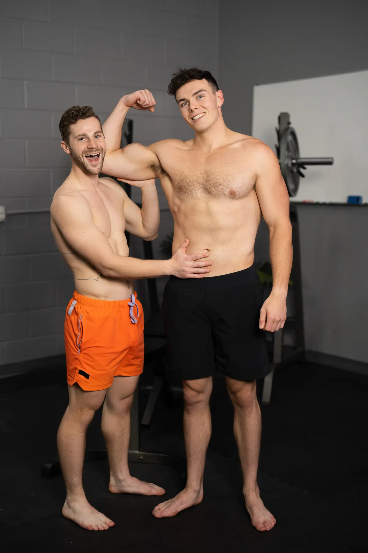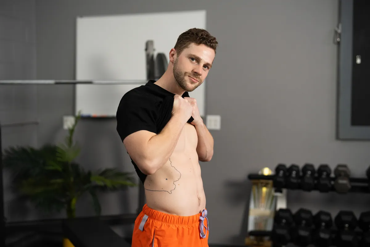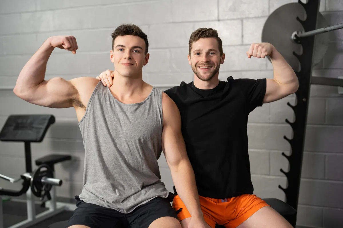 After their workout, Robbie leads Clark to the locker room and bends him over a bench to pleasure his hole. Clark returns the favor by servicing the top. In the doggy-style position, Robbie penetrates Clark, then commands him to “Sit on it.” They move to the floor where Robbie lays Clark down and pounds him until they both reach climax.
