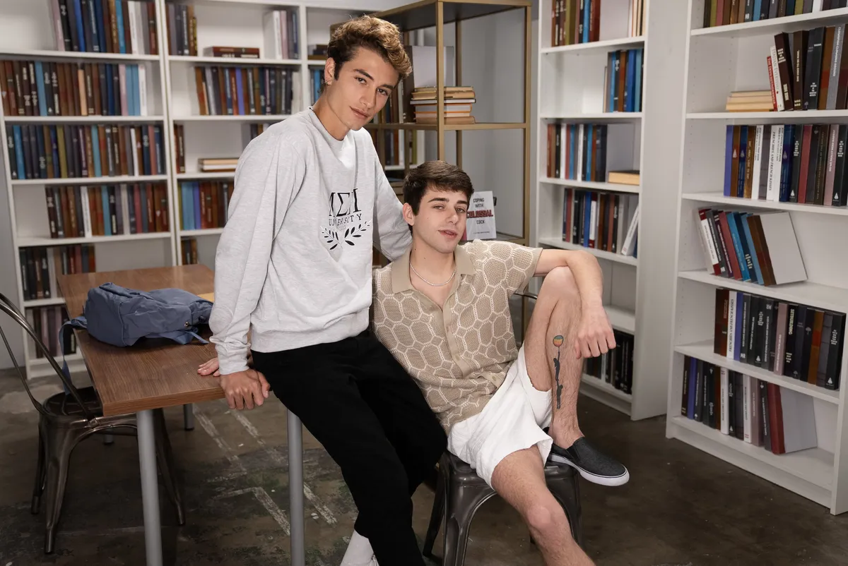 Horny twink Joey Mills and handsome newcomer Marco Alessandro meet in the MEN library and without wasting time decide to make too close contact. While studying, Joey Mills notices the attractive student, Marco Alessandro, covertly returning a book through the slot. Curious about the title, Joey tries to sneak a peek but ends up spying on Marco as he reveals his well-endowed manhood.