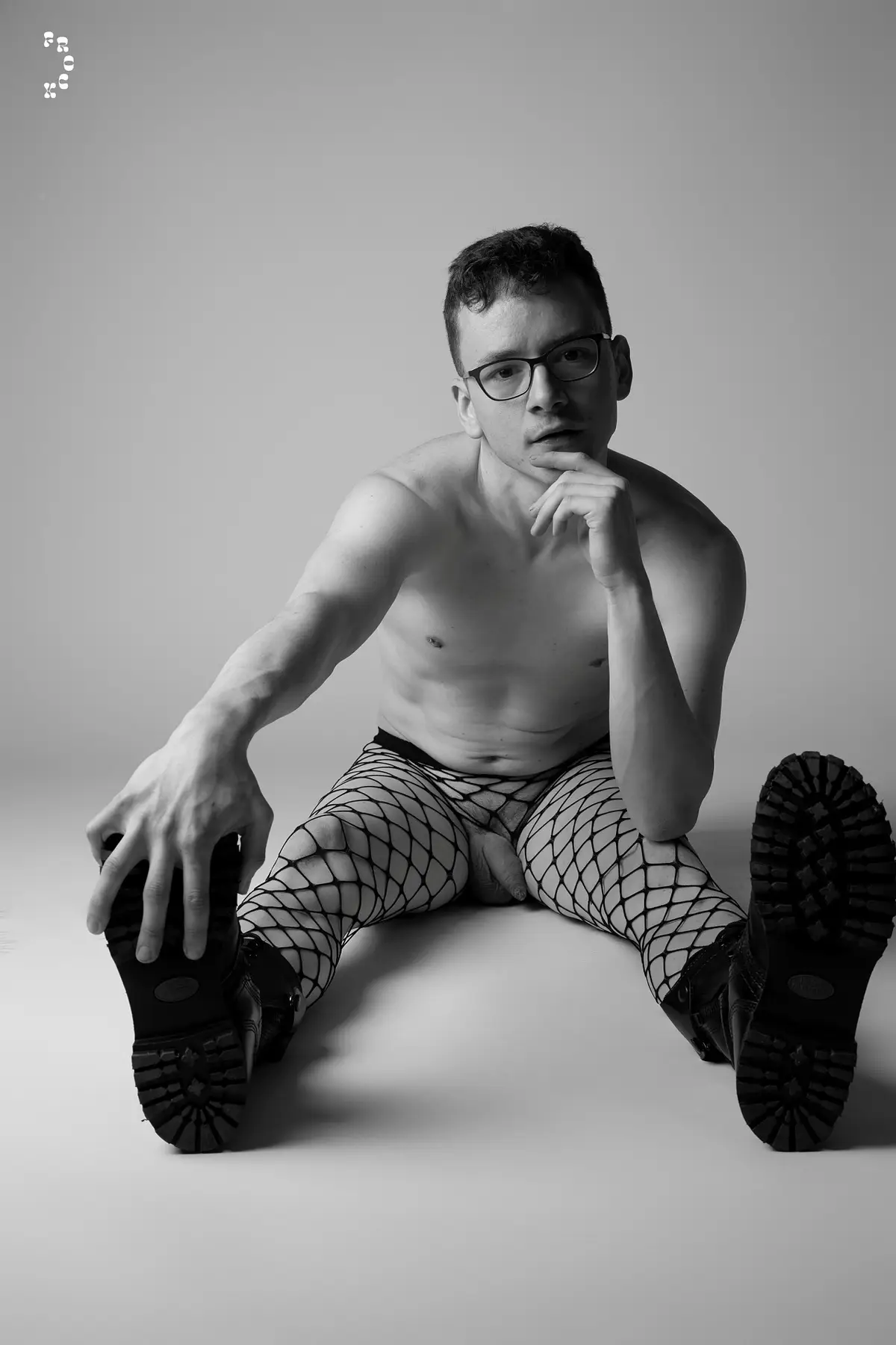 As soon as he arrives, he starts loosening up and preparing his muscles for the task ahead. He’s impressively flexible, able to even bend down and lick his own leather boots. David’s energy begins to build as he removes his jockstrap, exposing a partially erect penis that is still uncircumcised.
