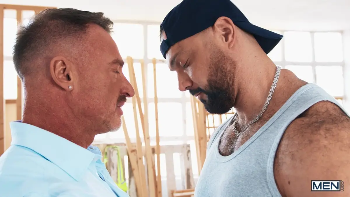 The sex is intense, Jacob’s thrusts relentless as he pounds Ross into the drafting table. Ross’s moans mingle with the sounds of the construction site, their bodies moving in a dance of dominance and submission. The scene shifts as Jacob pulls out and rolls Ross onto his back, the missionary position allowing for deep, penetrating thrusts. Ross’s legs wrap around Jacob’s waist, his nails digging into the builder’s muscular back as he rides each thrust.