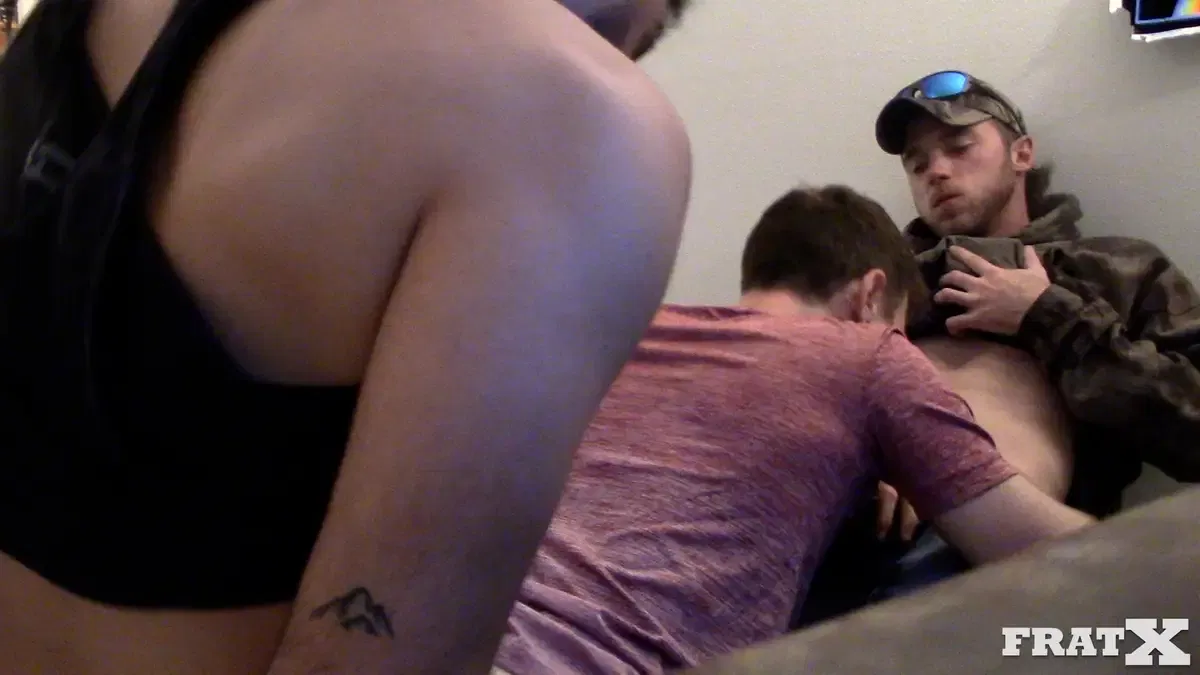 But the real show begins when they flip him over: his ass, already slick with lube, gapes impatiently. Maestro claims it first, pounding hard and fast as Davis feeds the bottom his dick, forcing tears down his cheeks. The room reeks of sweat and sex, moans echoing as the crew rotates—throat fucked by Gutierrez, ass split by Davis, Lopez’s load painting his tongue. By the finale, he’s a dripping mess: throat raw, hole stretched, stomach glazed with cum. FratX’s parties never disappoint—but this bottom? He’s unforgettable.