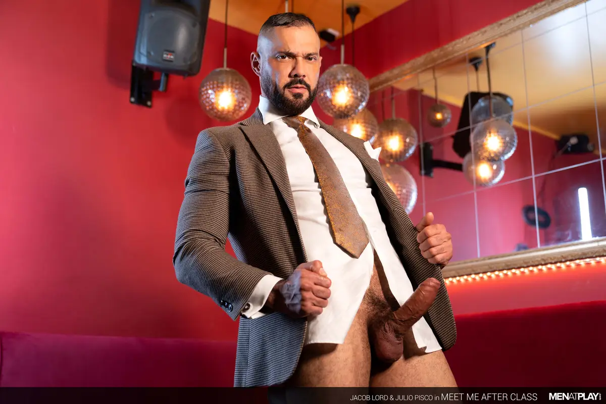 In Meet Me After Class by MenAtPlay, dressed in an elegant, light brown suit, Jacob Lord gives Julio Pisco multiple orgasms in a gay bar. In the film, Julio Pisco is a young and horny student who sets up an after-class tryst with his DILF professor, Jacob Lord, at Secrets Bar. The suited executive pulls Julio in, his voice a low rumble as he demands discretion. Julio, eager and confident, approaches Jacob and invites him to explore his muscular, taut body. Jacob’s hands roam Julio’s chest, tweaking his hard nipples, drawing a sharp intake of breath from the eager student.