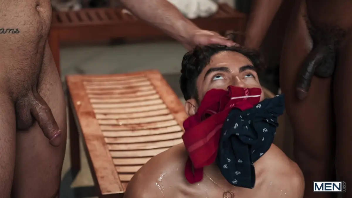 The locker room becomes a battlefield for Alfonso Osnaya, the nerdy jockstrap-sniffer who gets his wish—and then some. Ty and Zayda corner him, spitting-roasting the twink in a feral train: Alfonso’s throat stretches around Ty’s rod, then Zayda’s, their rhythm unrelenting until both claim the twink’s ass, his screams muffled by their hands.