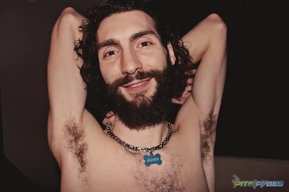 Pup Asher locks eyes with the camera, his scruffy charm radiating as thick, veined cock springs free from bushy pubes. Fingers clamp around his swollen meat, stroking with rough urgency while his other hand mauls the hairy treasure trail below. Every tug at his heavy sack draws low grunts, his nostrils flaring as he buries his face in sweat-drenched pits—animal musk fueling the frenzy.