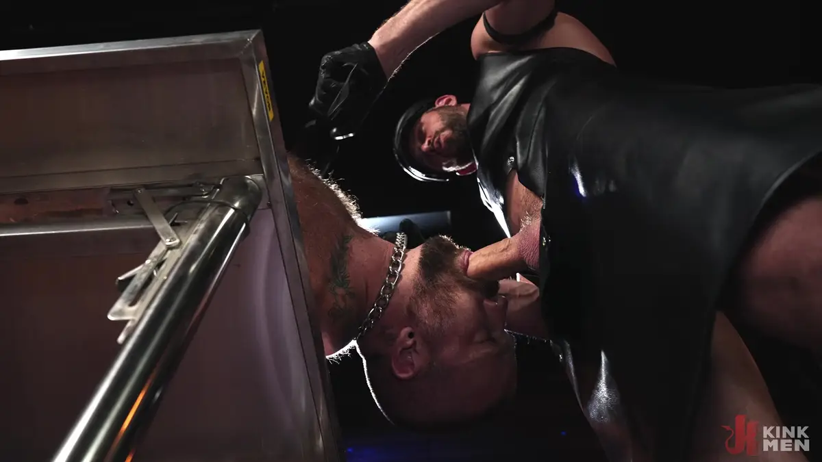 Johnny then uses a gloved hand to open Jayson’s mouth, feeding him his cock and face-fucking him while continuing to strike his body. He moves Jayson into stocks, opens him wide with a large dildo, and, without pause, flogs his ass while thrusting deep into him.