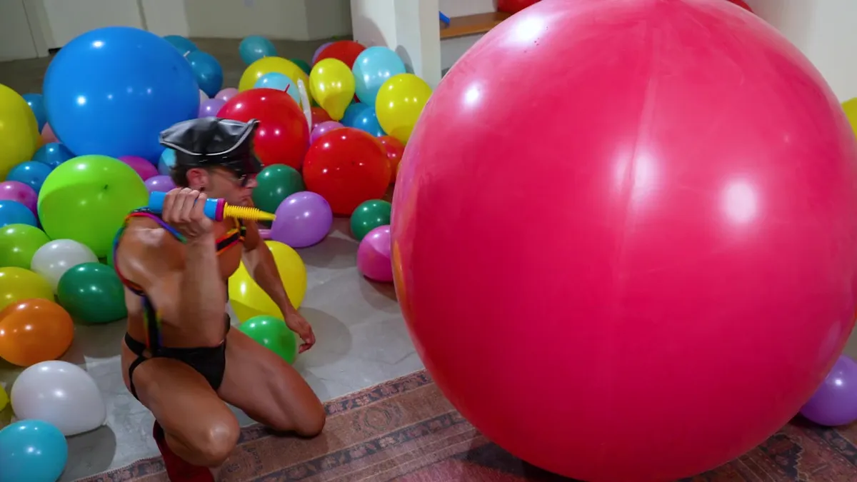 Quin Quire, the dominant Dom Daddy, immediately shifts his focus to Seth Peterson as soon as he hangs up with Danny Fantasy. With a swift motion, he removes Seth’s ball gag and pops the enormous balloon encasing Seth’s muscular frame. Quin’s big, hard dick finds a new home, filling both Seth’s mouth and ass simultaneously. The room echoes with the stimulating sounds of latex squeaking and balloons popping as the two looners move fervently, grasping the balloons around them, and fucking bareback on several gigantic inflatables.