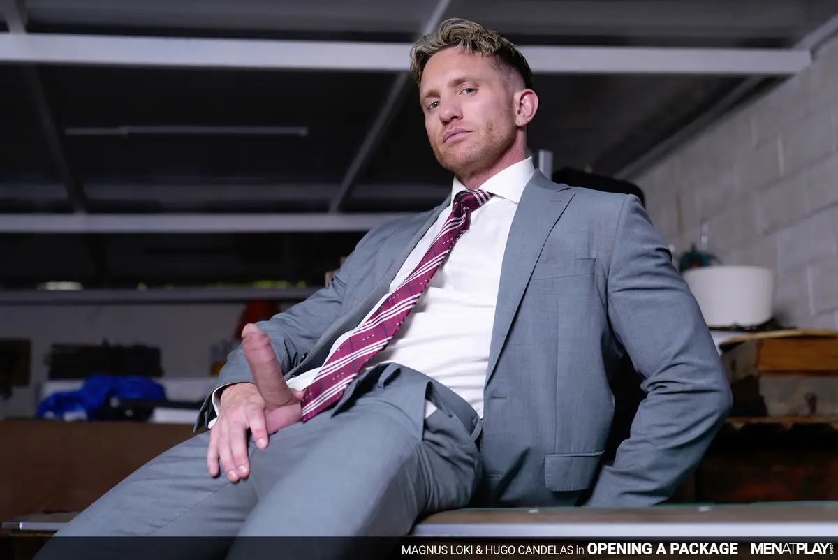 In Opening a Package by MenAtPlay, Hugo Candelas delivers a really big package to Magnus Loki, which the businessman will take from behind. Magnus Loki, a sharp business owner, watches as Hugo Candelas, the new deliveryman, carries several boxes into his building. Magnus directs Hugo to leave the packages in the storage room. After setting them down, Hugo notices one box with a distinctive label: “For Men Who Play Hard.”