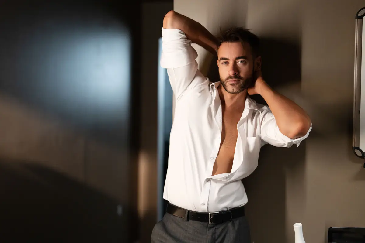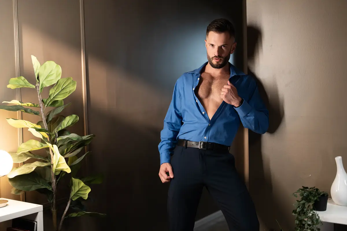 It doesn’t take long. Zac Barrett starts to feel the heat. You can almost see the sweat beading on his skin as he loosens his tie, then undoes the top buttons of his shirt. Holden Beau sneaks a peek, and wait until you see the view he gets. Zac Barrett is leaning back, fanning himself, his shirt falling open to reveal a toned chest.
