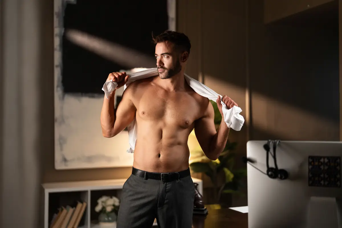 You’re going to feel the tension when Holden Beau takes Zac Barrett into his mouth. Zac Barrett lets out a groan you’ll wish you could hear for yourself. Then it’s Zac Barrett’s turn. He pulls Holden Beau up and kisses him hard, his tongue exploring like he owns the place already. You’ll love seeing Zac Barrett take control, turning his boss around and bending him over that very desk.