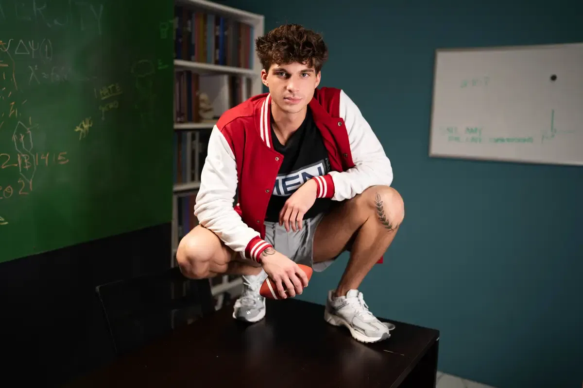 The scene opens with a deceptive calm as college guy Leo Levine ditches class with a plan. He’s got a secret, and when his buddy Kane Fox shows up, the game begins. That mini football isn’t what it seems—Leo’s clever reveal of the hidden stroker sets the tone for this wild gay porn adventure.