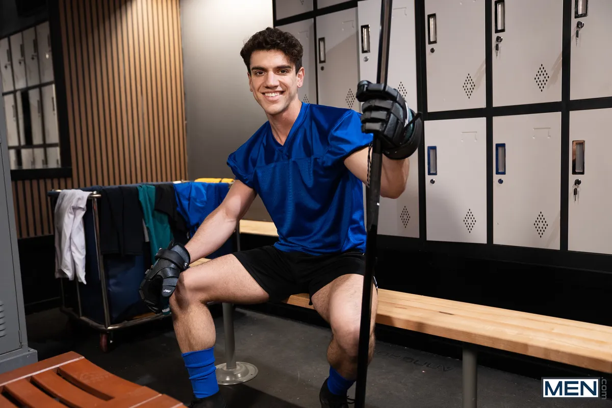 It’s game day, and the locker room is filled with celebratory laughter as the excitement of their victory lingers in the air. Channing and Christopher, caught up in the thrill of the moment, discover a playful distraction from their teammate’s antics as Christopher can’t help but admire Channing’s bulging package through his shorts. He grabs his lacrosse stick and starts teasing Channing with it, scooping the shaft and feeling its weight, a suggestive prelude to what’s about to come.